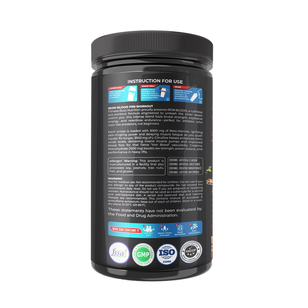 With 200mg caffeine in one scoop, Iron Blood gives a strong start when training feels tough. This Iron Blood pre workout supports energy, focus, and a fuller pump without making things complicated. It is easy to use too. Just mix one scoop in water, shake well, and drink it before your session